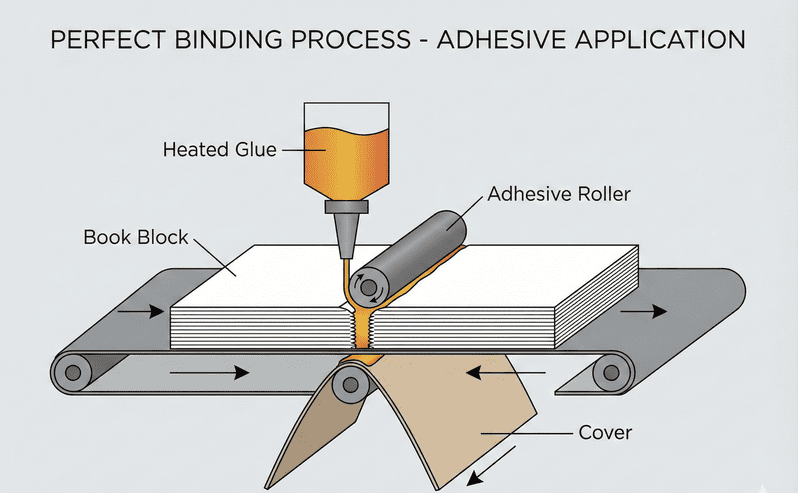 Perfect binding is a widely used method where single pages are stacked together, the spine edge is ground down to create a rough surface, and a strong adhesive is applied to glue the pages directly to the cover. It creates a clean, flat spine and is very cost-effective.