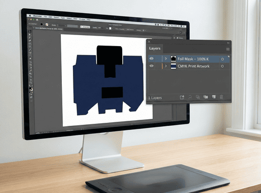 To prepare your file, create a separate, clearly labeled layer for the foil design. All elements on this "foil mask" layer must be 100% solid black and in vector format. This file tells the printer exactly where to apply the foil.